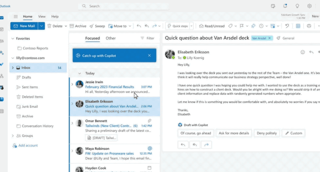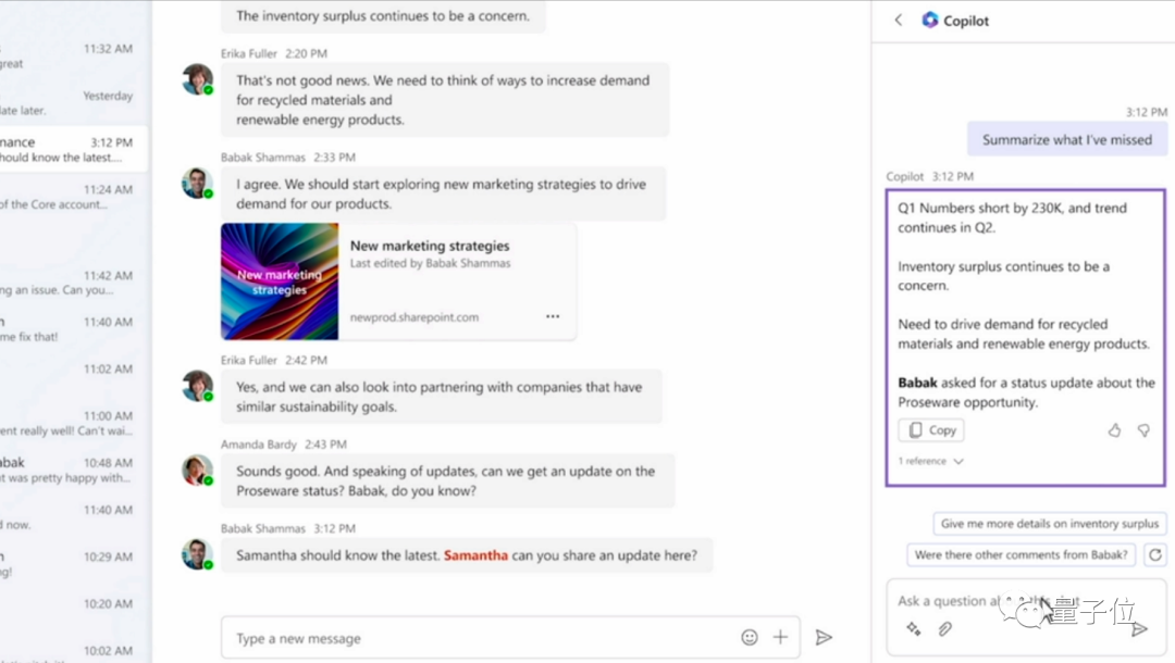 Copilot的“Catch up”功能可以帮你挑出最有信息量的那些,并总结出对应的要点,比如一封是某某下属进行的财务业绩汇报、一封是关于某业务销售额下降的讨论等等。