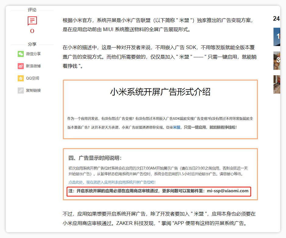 其实在 2021 年 ZAKER 科技就发表过植入启屏推广报道,文章说到应用如果想要开启系统开屏推广,除了开发者要加入 “米盟(小米广告联盟)”,应用本身也必须要在小米应用商店审核通过。