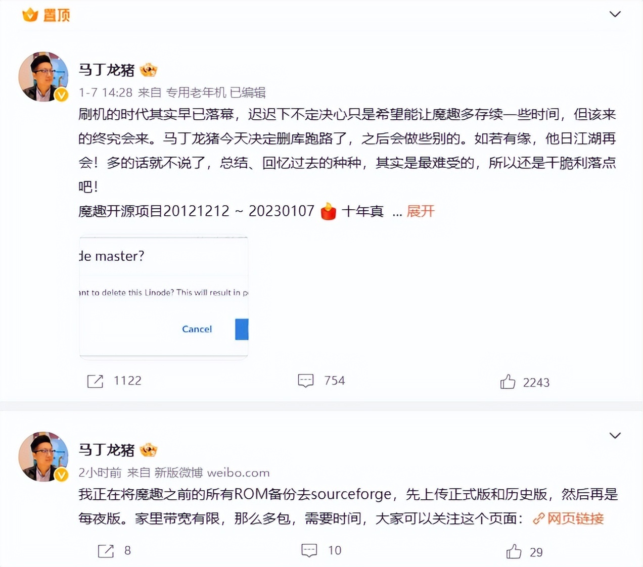 不过 @马丁龙猪 最新微博表示:就是删库跑路一时爽,有些东西其实还是值得备份一下的。正在把魔趣之前的所有 ROM 备份去 SourceForge,先上传正式版和历史版,然后再是每夜版。