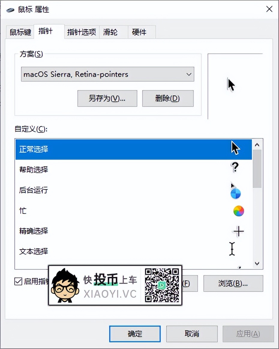 可以直接安装「MacOS」样式的鼠标指针,右键 “Install.inf” 文件安装,然后在设置 → 设备 → 指针选项,选择指针样式。