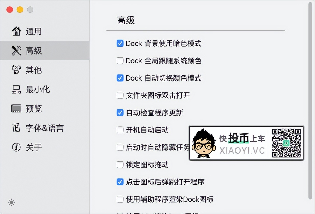 「MyDock」设置功能上支持调整图标大小、自定义替换图标、使用暗色模式、最小化动画效果、模糊效果、字体设置等等。