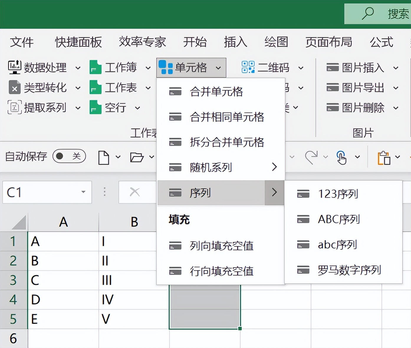 在单元格填充上,可以选数字序号和罗马数字等,也比效率专家选择多一点。