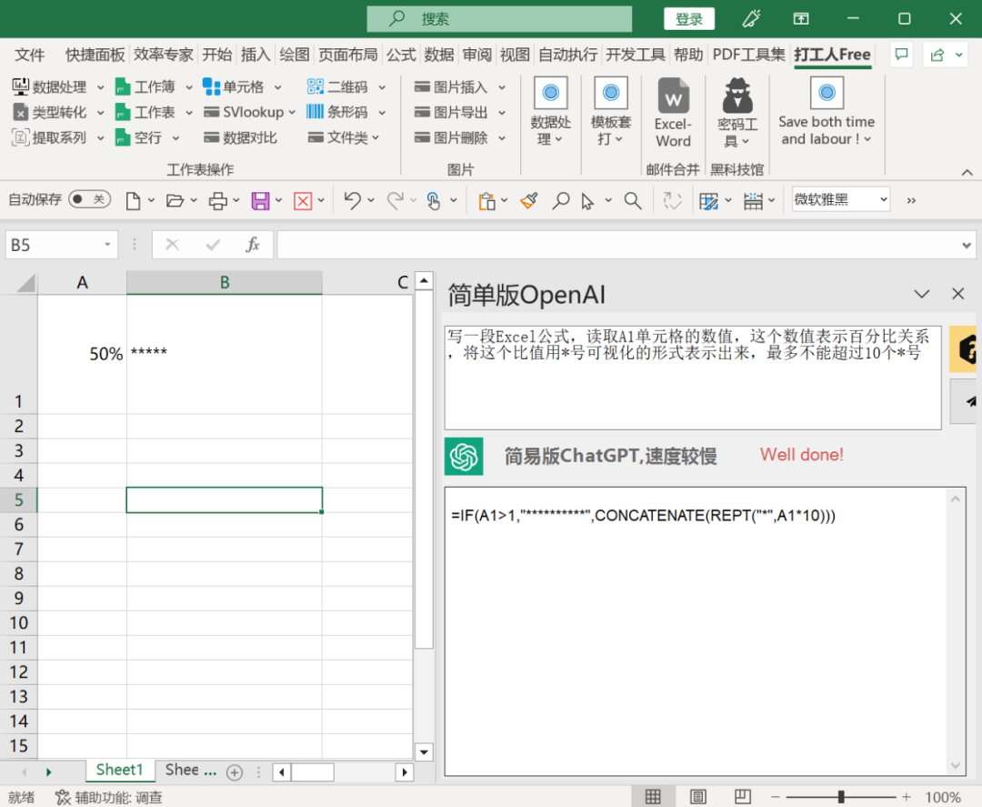 里面虽然集成的是简易版ChatGPT,但是也可以用它来帮你解决一些奇奇怪怪的问题,比如说你可以这样问它:“写一段Excel公式,读取A1单元格的数值,这个数值表示百分比关系,将这个比值用*号可视化的形式表示出来,最多不能超过10个*号。”
