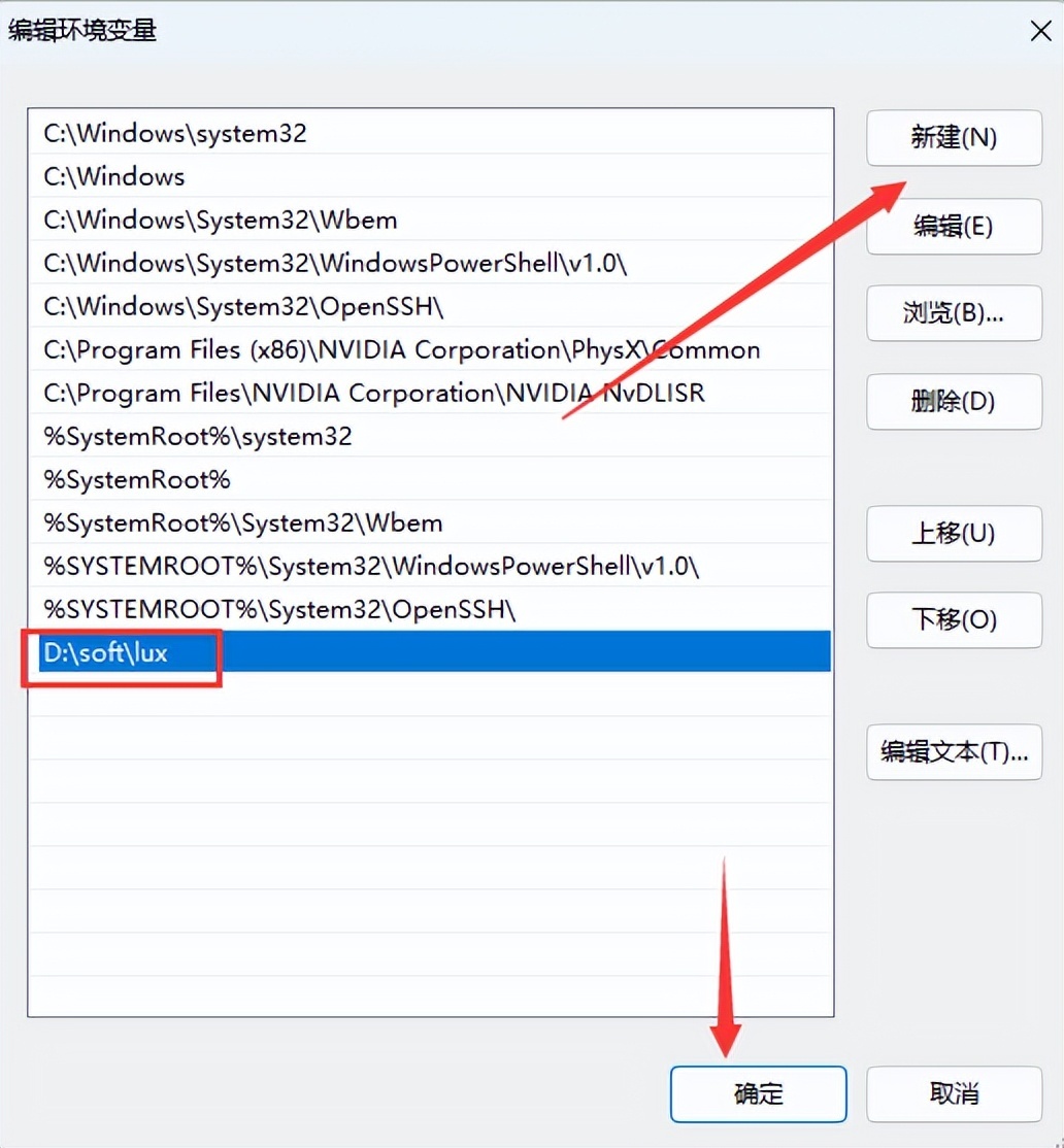 - 设置编辑环境变量,步骤是“右键我的电脑——属性——高级系统设置——环境变量——系统变量里找到 Path——编辑——新建变量值设置为第一步设置的路径,比如 c:\soft\lux(不是 c:\soft\lux\lux.exe)——最后一路按确定,我这里是设置在 D 盘,D:\soft\lux