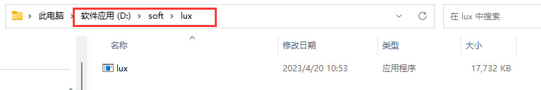 - 在 C 盘(或者其它盘根目录)soft 文件夹(没有也新建文件夹命名)下创建一个文件夹命名为“lux”,然后把提供压缩包解压出来的 lux.exe 文件复制到里面。