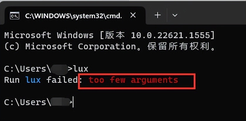 接着 Win+R——输入 cmd——录入 lux,如果出现“too few arguments”说明已经安装成功。