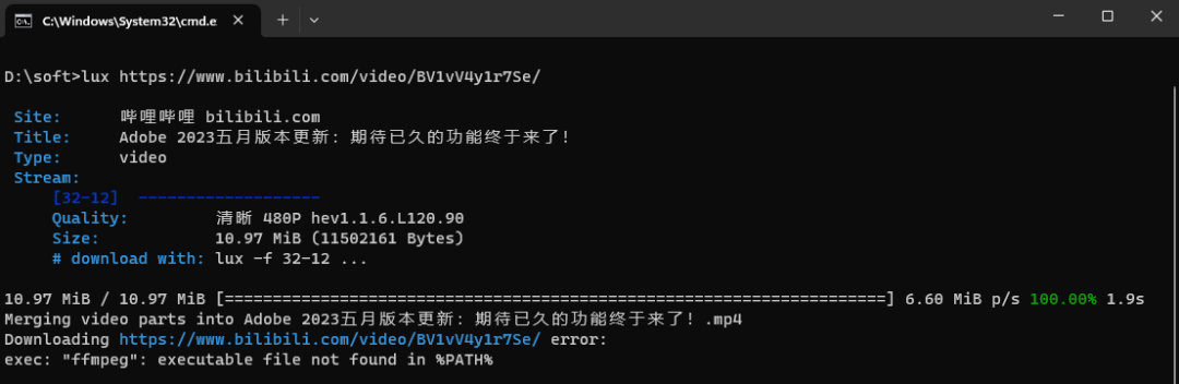 - 「在路径栏直接 cmd」,就可以进入下载命令框里,然后录入 lux+视频链接,如: