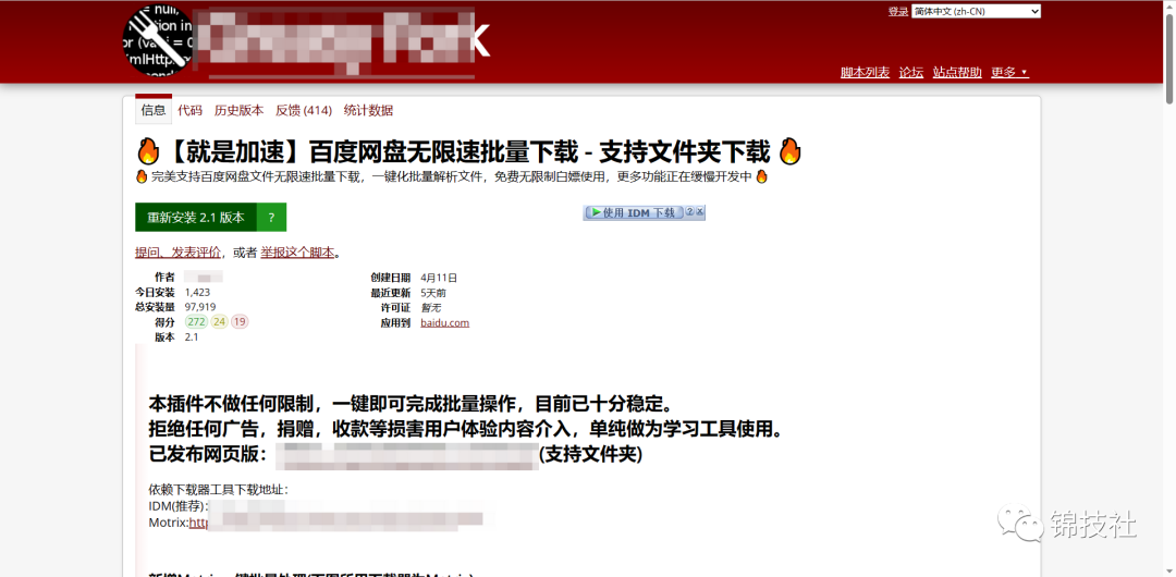前几天的一篇文章给大家分享了IDM+油猴插件不限速下载度盘资源的方法,但是现在需要验证码才可以使用。今天继续给大家分享一款最新可用的脚本,配合IDM实现资源不限速下载,2023.6.30测试可用!