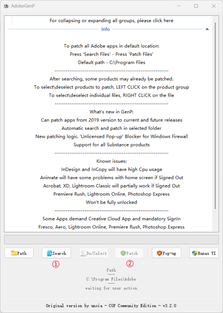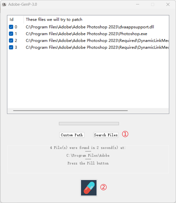 GenP使用方法也比较简单,运行RunMe.exe后,首先点击“Search Files”,目的是寻找安装目录下的相关文件,如果找不到可以点左侧的“Custom Path”,手动选择Adobe的安装目录。当软件识别到需要破解的这些文件后,这时就可以点击最下方的「药丸」按钮了~至此大功告成!