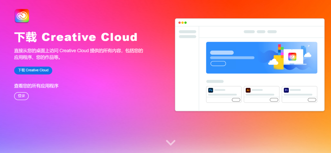 Adobe官方要求下载Creative Cloud(CC)后,然后通过它来管理下载各种组件,例如AE、PS、PR等等。安装CC需要注册一个免费账户,安装完成后退出。