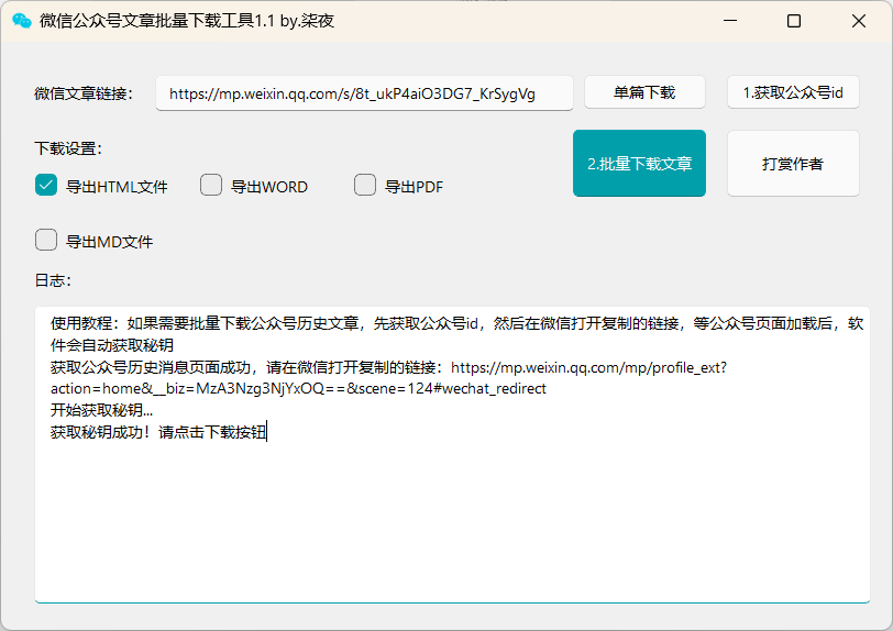 ②打开上述链接后,工具中会提示“获取密钥成功!请点击下载按钮”。这时点击“”批量下载文章即可。注意下载设置中,可以自行设置文件格式,这里我只勾选了“导出HTML文件”。