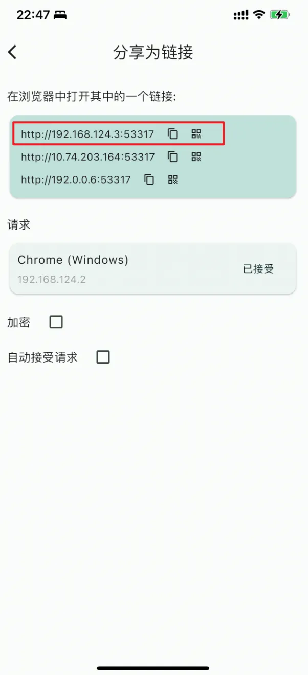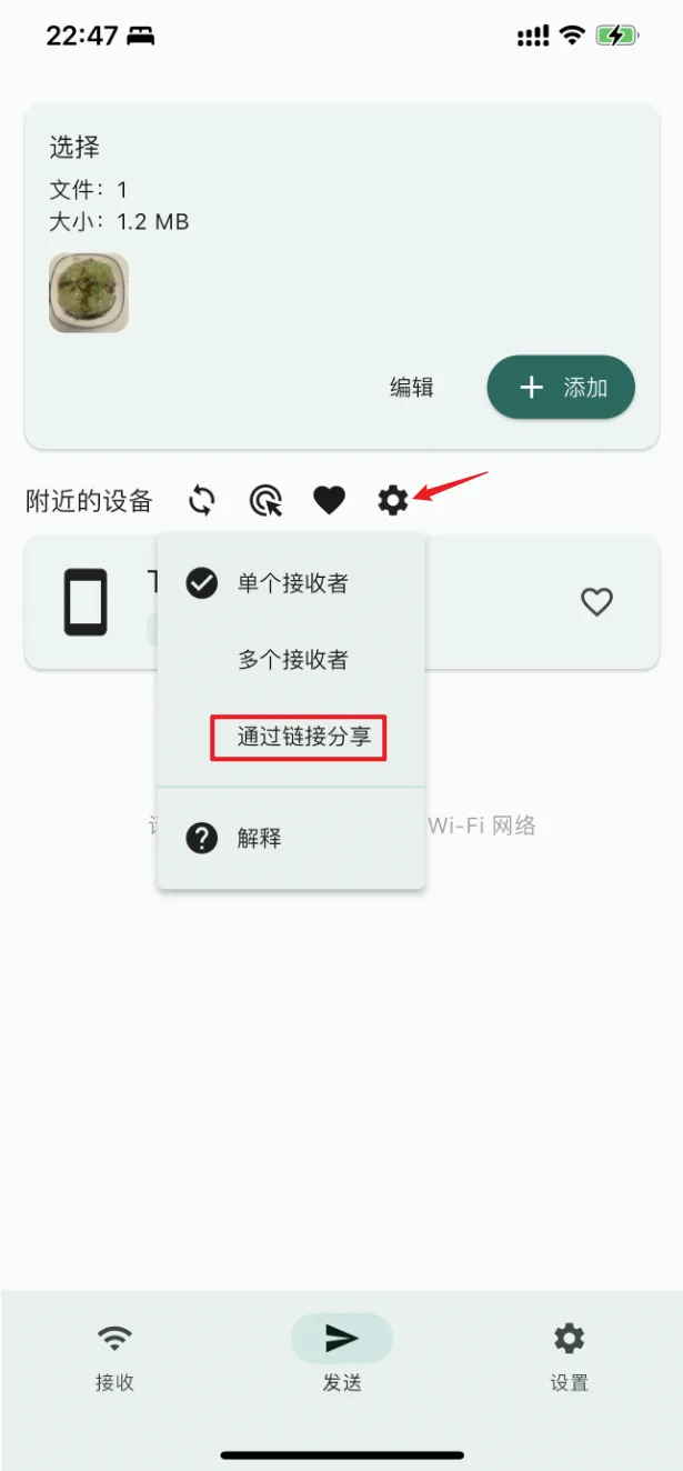 有时候在手机端搜不到电脑,可以使用分享链接的方法。在手机端点击设置按钮,选择“通过链接分享”,下图可见给出了三个下载链接,这时可以在电脑的浏览器中输入下述地址,即可将文件下载下来。(手机端会收到下载的提示,请确认允许即可)