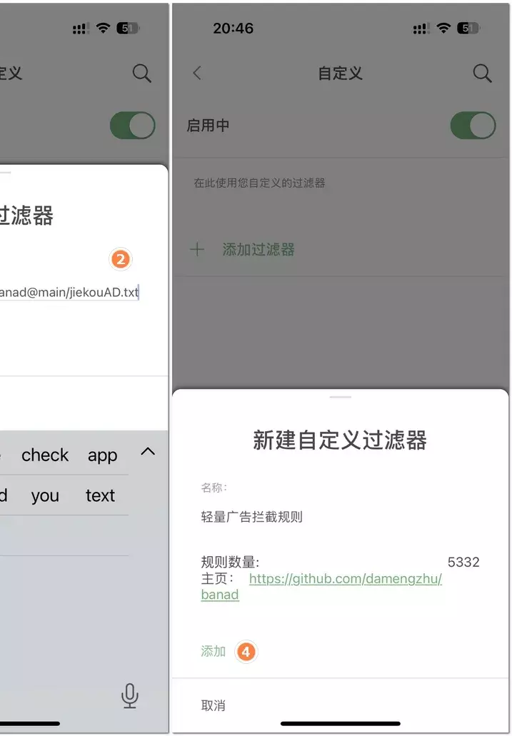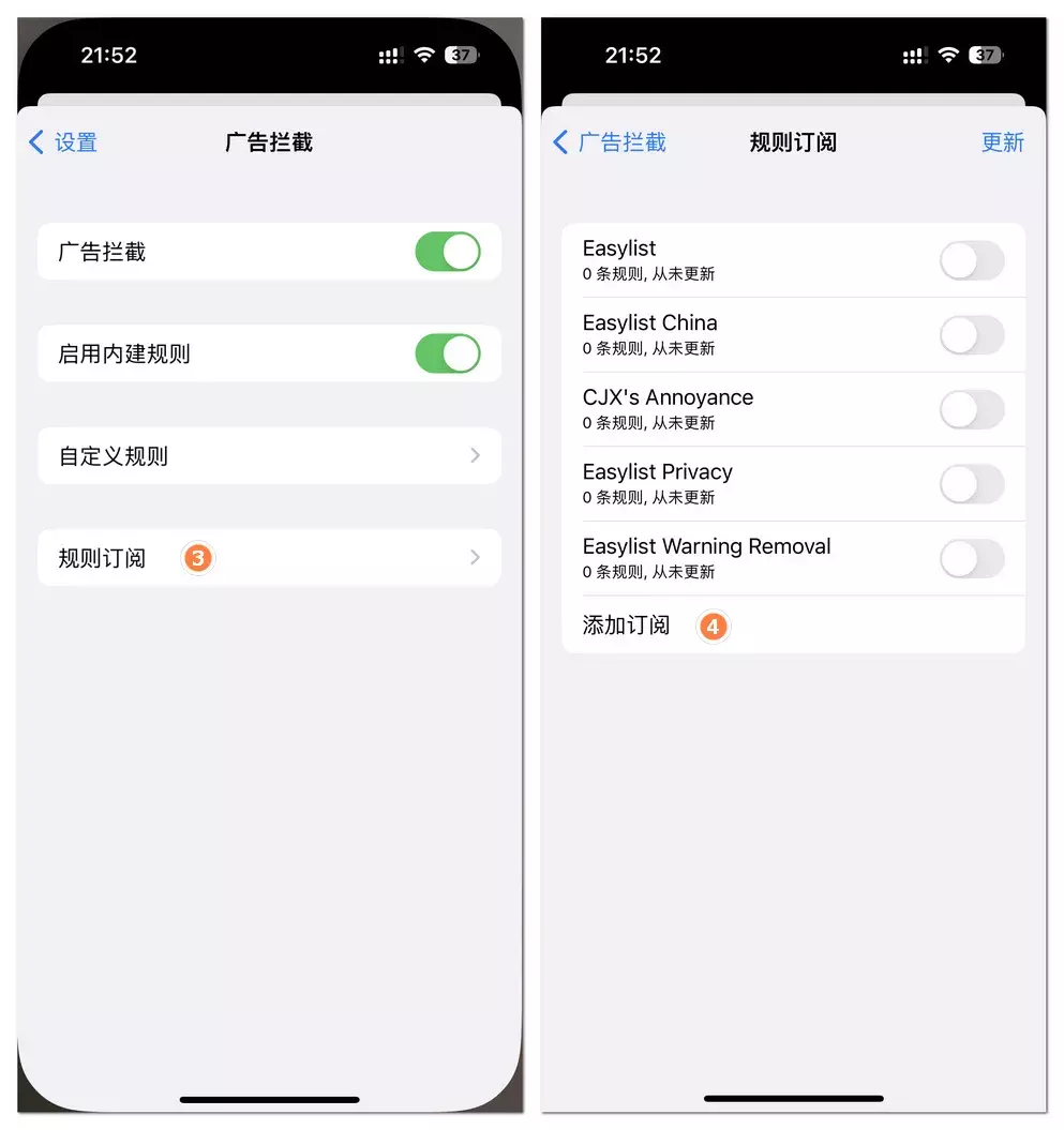 以Via浏览器为例,打开设置 » 广告拦截 » 规则订阅 » 添加订阅,输入规则地址即可: