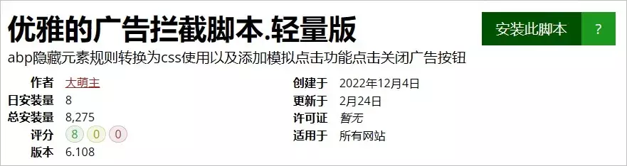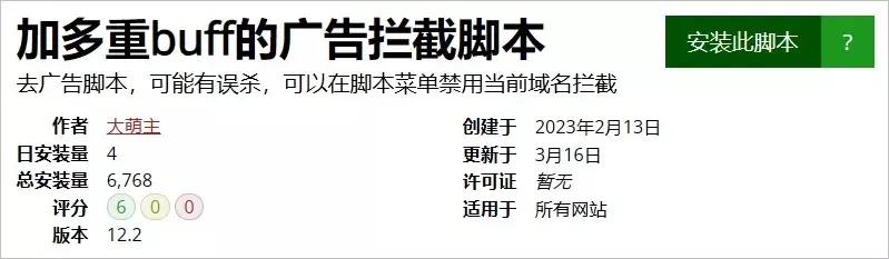 还有就是广告拦截脚本在油猴上其实相当至多,虽然多数是针对性屏蔽某个网站广告的,但也不乏存在下面这类,通用型的广告拦截油猴脚本