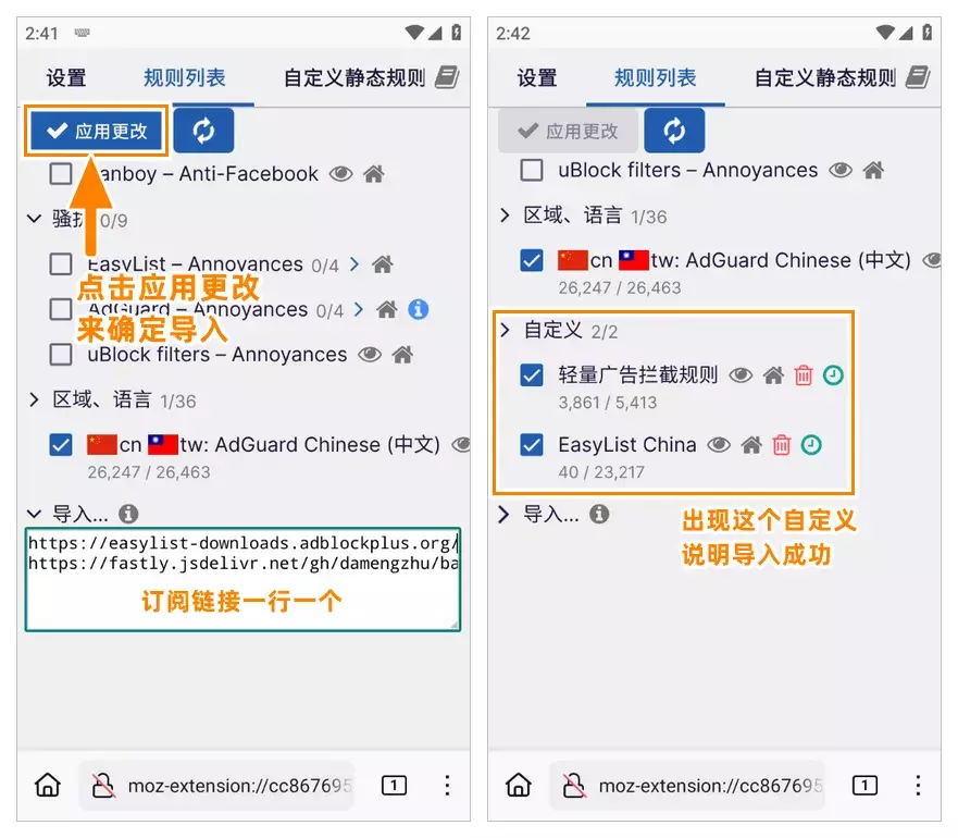 谨防小白:导入规则这里,订阅链接一行一个,然后需要点击上方的应用更改来确认导入,最后在 uBlock 中出现自定义拦截规则说明导入成功了