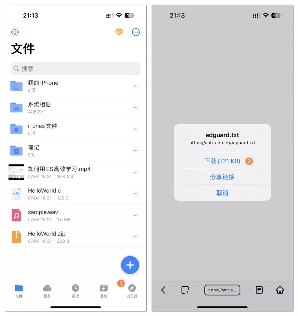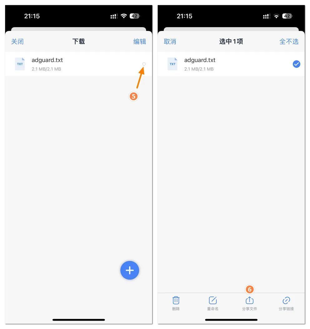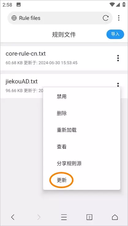 打开ES文件管理器,用右下角的浏览器打开你想要导入的规则文件地址,然后选择下载,下载完成之后点击底部的菜单栏进入下载文件管理,选中txt文件之后分享文件,在菜单中选择存储到“文件”,保存到我的 iPhone 的任意文件夹内即可