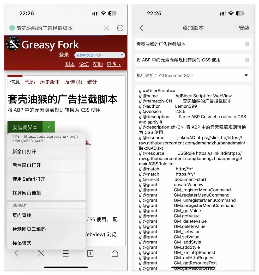 后续脚本的安装真的没啥好说的,一般就是在浏览器里面打开脚本地址,点击安装即可。对于部分浏览器,比如亚瑟浏览器,可能会需要你长按绿色的「安装此脚本」然后在新窗口打开才能进行后续安装步骤