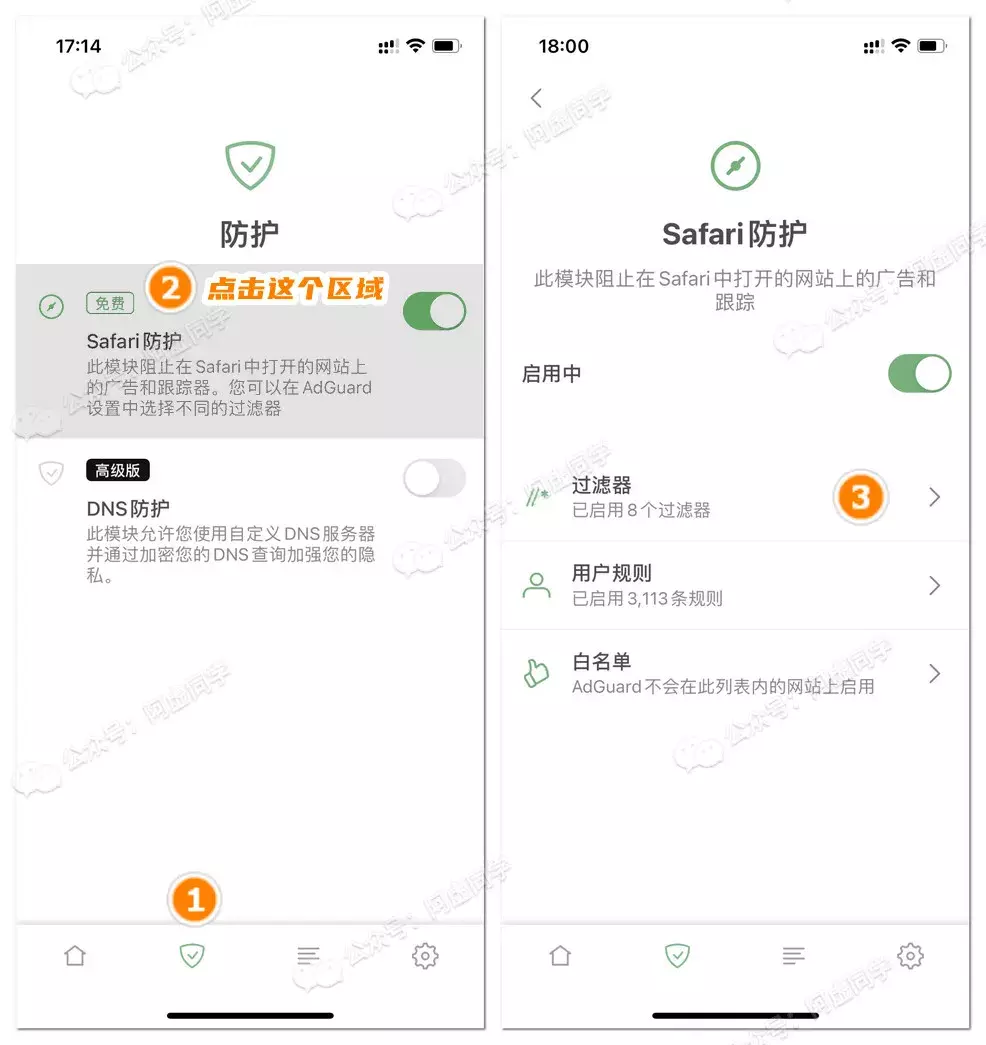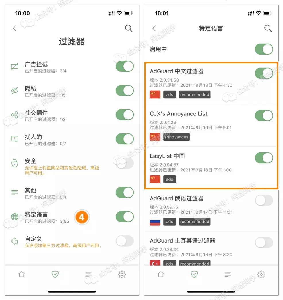 AdGuard 免费内置的广告拦截规则其实已够多数情况使用,只需要打开APP防护 » Safrai防护 » 过滤器,在特定语言一项中开启「CJX‘s Annoyance List」、「EasyList中国」这俩个拦截规则后,就能拦截绝大多数的网页广告了