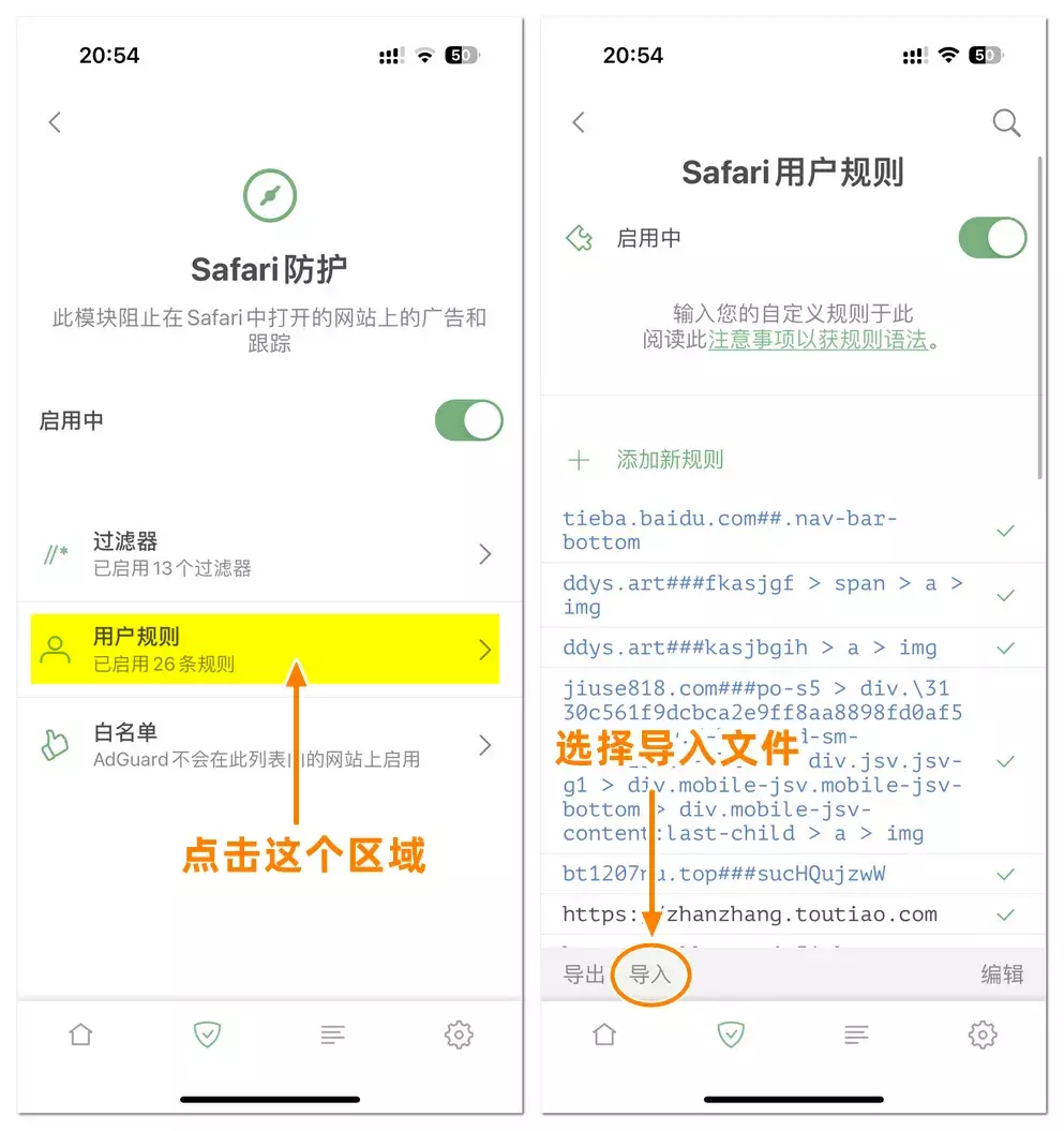 然后在 AdGuard 中找到 Safrai 防护 » 用户规则 » 导入刚刚那份 txt 文件即可