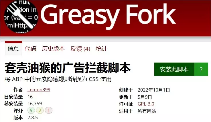 还有一类情况就是浏览器不支持导入自定义广告拦截规则,但是支持安装油猴脚本,比如Focus、狐猴浏览器、亚瑟浏览器、鲨鱼浏览器、Gear等