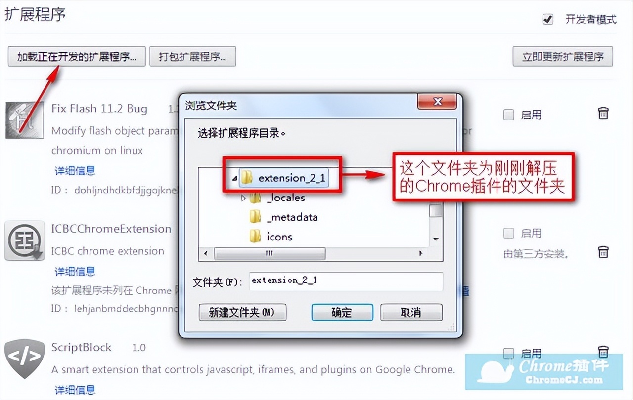 4.在勾选开发者模式选项以后,在该页面就会出现加载正在开发的扩展程序等按钮,点击“加载正在开发的扩展程序”按钮,并选择刚刚解压的Chrome插件文件夹的位置