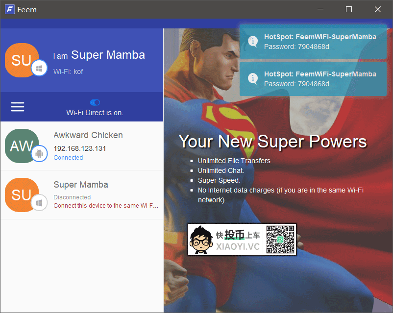 而「Feem」体验上非常不错,基于不需要学习成本,可以做到真正跨平台,完全局域网互传资料、不用担心资料泄露、官方表示还使用 TSL 加密本地传输、文件无大小限制、可断点续传。硬要说缺点那就是大家吐槽的广告吧,每次传送完文件,都会弹出一个广告,得手动关闭。