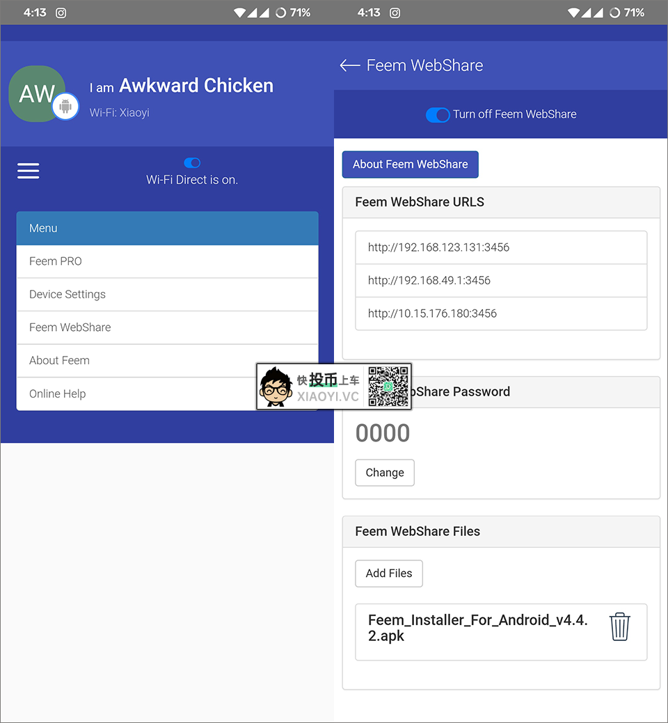 「Feem」还支持网页端,在菜单里选择 “Feem WebShare” 并开启可以让 PC 或者 移动端 生成网页模式,默认会生成网页端的访问 IP 地址 和 密码。然后点击 “Add Files” 添加你要发送的文件。