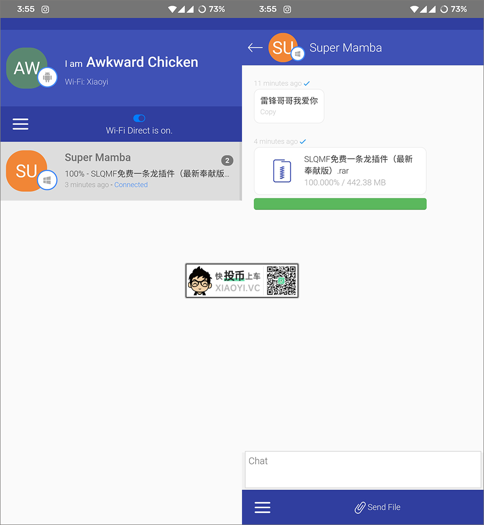 在另外一端设备用浏览器访问 IP 地址和输入密码就可以传送文件了。如果在没有网络/路由器的情况下,手机可以开热点模式,让其它手机连接热点WIFI ,然后通过网页方式分享传送文件还是不错的,至少比蓝牙方式要快得多。