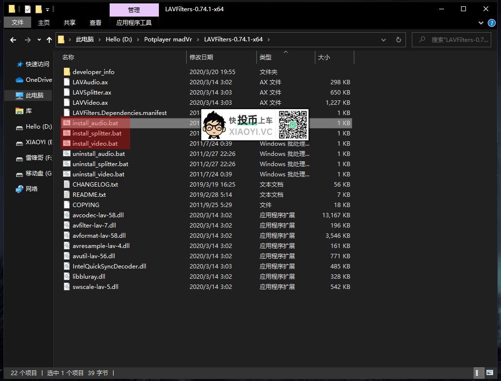 “LAV” 文件夹点进去以管理员身份运行 “install_audio.bat”、”install_splitter.bat”、”install_video.bat” 批处理安装。