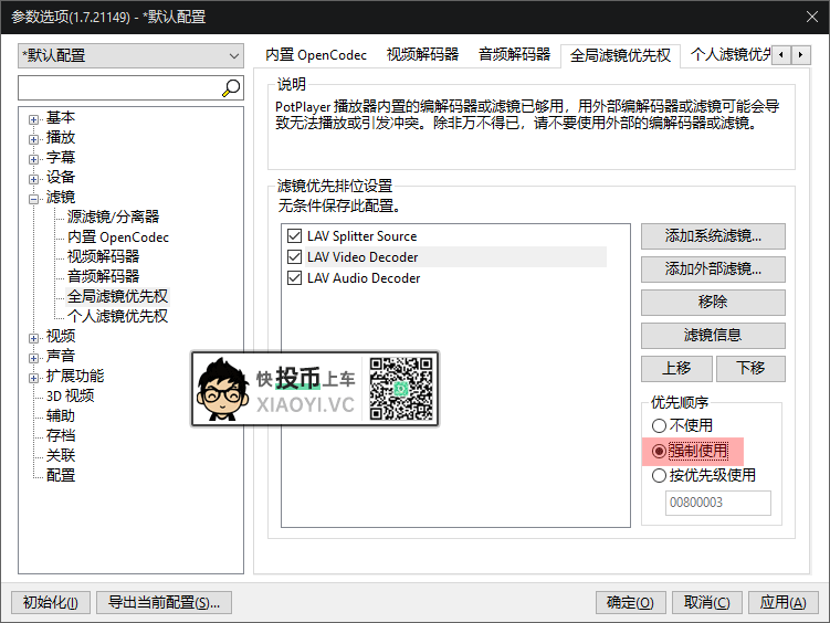 强制使用LAV解码:进入「Potplayer」的设置 → 滤镜 → 全局滤镜优先权,选择 “LAV Video Decoder” 点击强制使用。