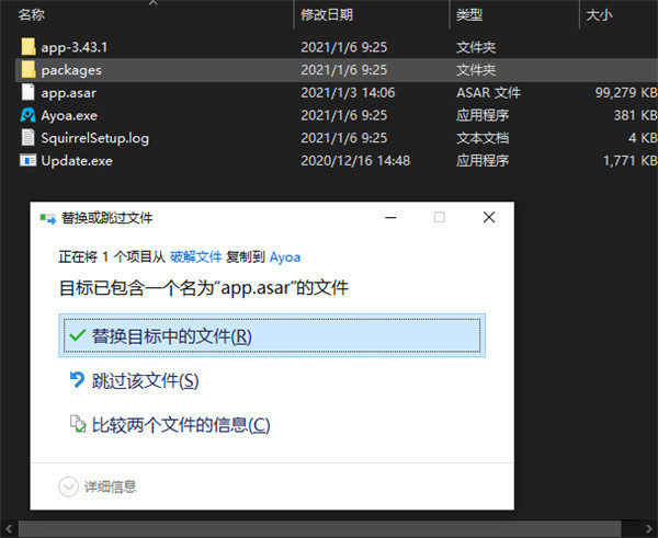 2、双击Ayoa+Setup+3.43.1.exe运行安装,自动进行安装,然后将crack下的app.asar复制到C:Users用户名AppDataLocalAyoaapp-3.43.1resources中,点击替换目标中的文件