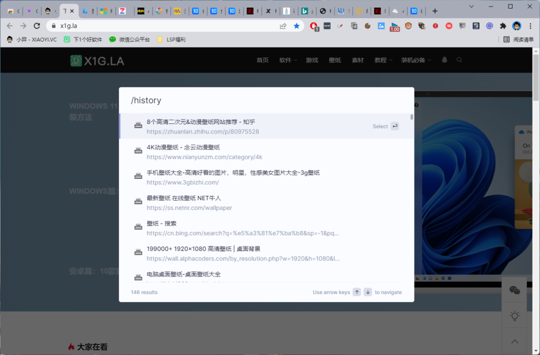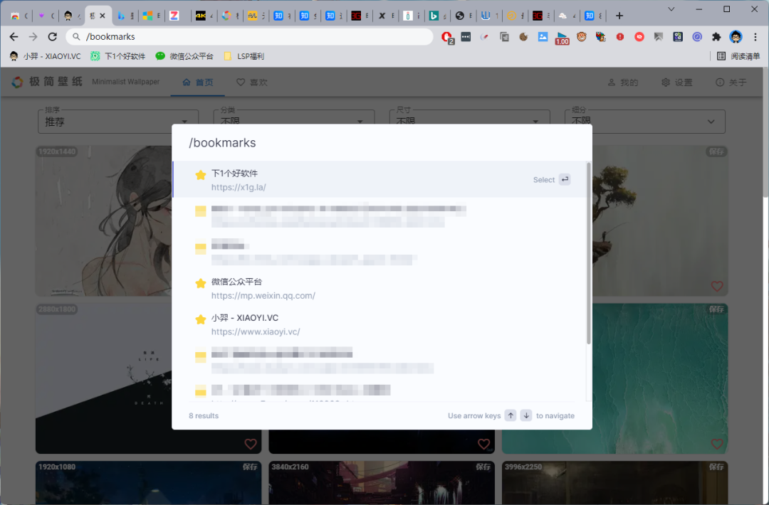 浏览器历史记录也是经常会用到的,虽然浏览器自带有历史管理页,现在也可以用「Omni」来进行历史搜索,输入 /bookmarks 即可显示所有历史记录页面。