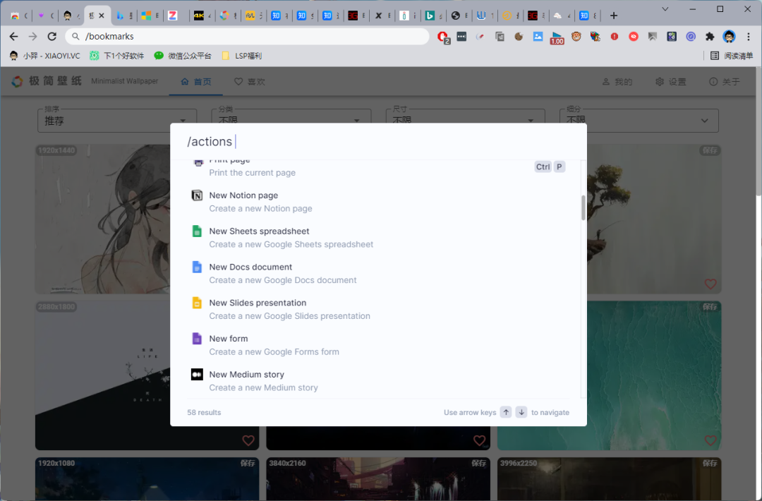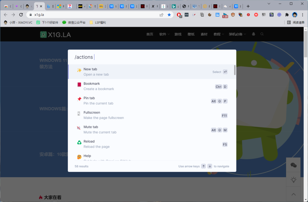 「Omni」还支持浏览器功能快捷操作,输入 /actions 搜索所有可用的操作,例如可以 Pin 标签页、标签页静音、全屏,重新加载等等。