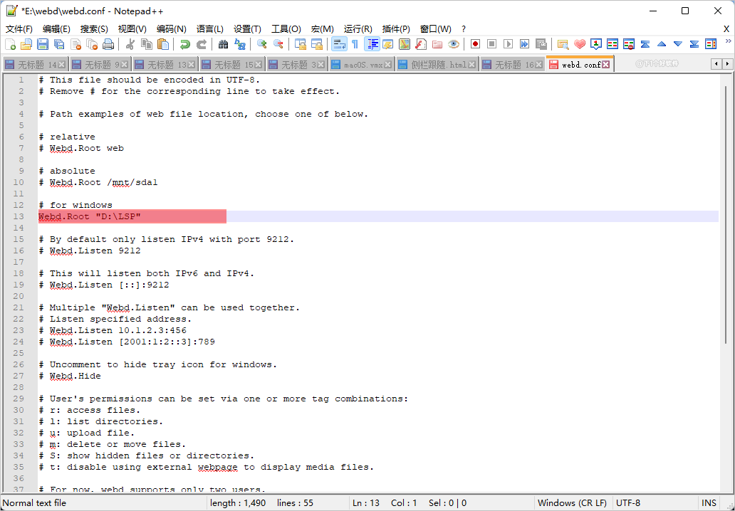 设置共享目录方面:默认是根目录的 web 文件夹,需要设置指定目录的话,用记事本打开 “webd.conf” 文件,找到 # Webd.Root “D:\my share”,然后把 # 去掉,后面修改成你的路径即可,然后重启软件。