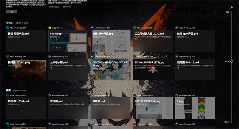 TimeLine 也就是时间线功能,在 Windows 10 当你按下 Win+S 任务切换时,会显示你的活动历史记录,但是这个功能带来的是涉及你的隐私泄露,例如别人就可以轻松看到你平时在浏览啥网页……