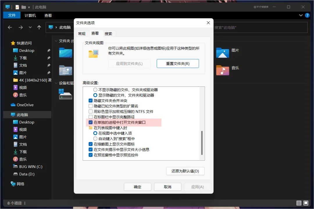 在首个 Windows 11 预览版微软还保留着旧资源管理器,可以通过选项 – 查看 – 选上 “在单独的进程打开文件夹窗口”开启。