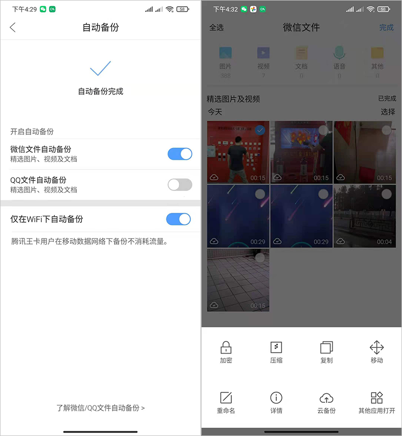 如果你不是小米手机用户,可以使用腾讯出品的「腾讯文件」应用,支持自动云备份微信 、QQ 的图片、视频、文档,并且无限容量空间。