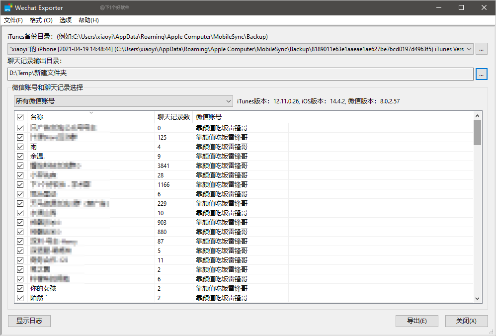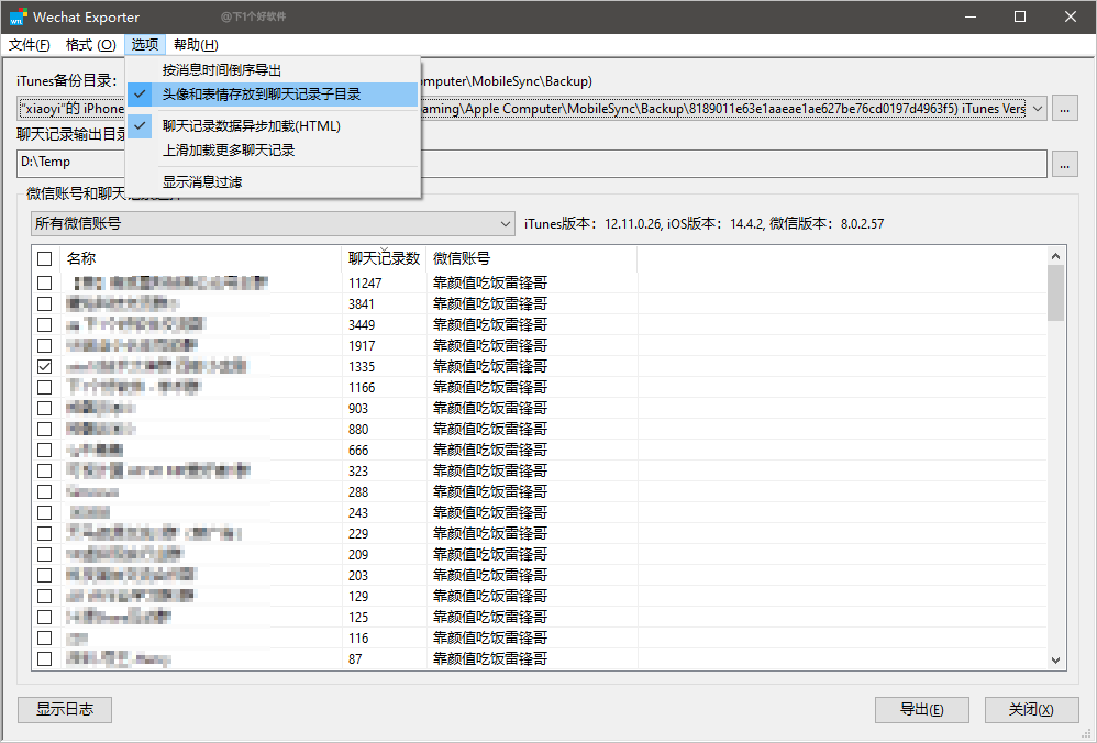 3.等待备份好后,运行「WechatExporter」软件会自动读取你的 iTunes 的备份文件,然后设置聊天记录输出目录,选择你要导出的联系人,也支持批量导出。