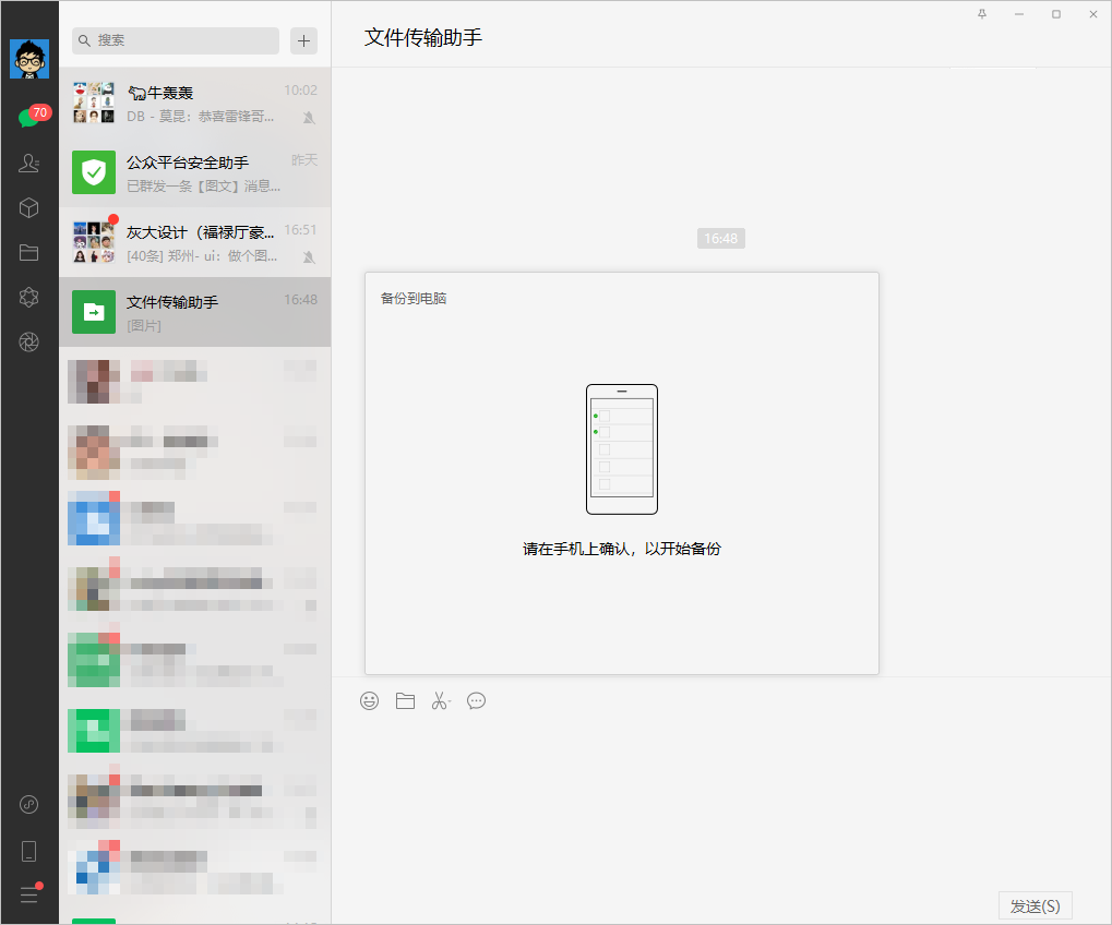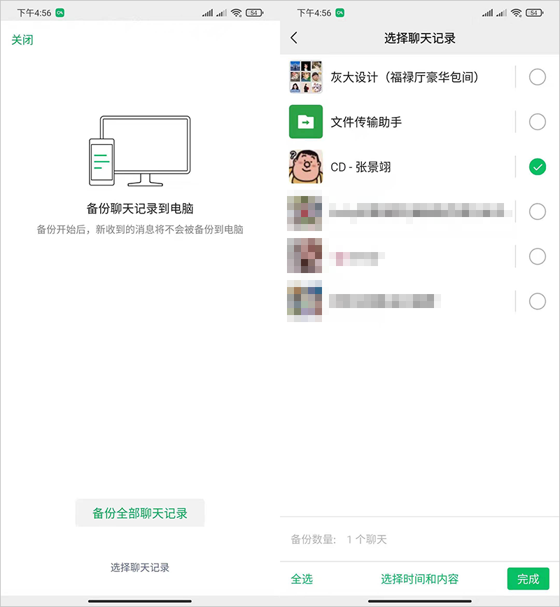 手机上也可以单独备份联系人聊天记录内容,点击 “选择聊天记录”,选择联系人,然后就会备份到电脑上了。