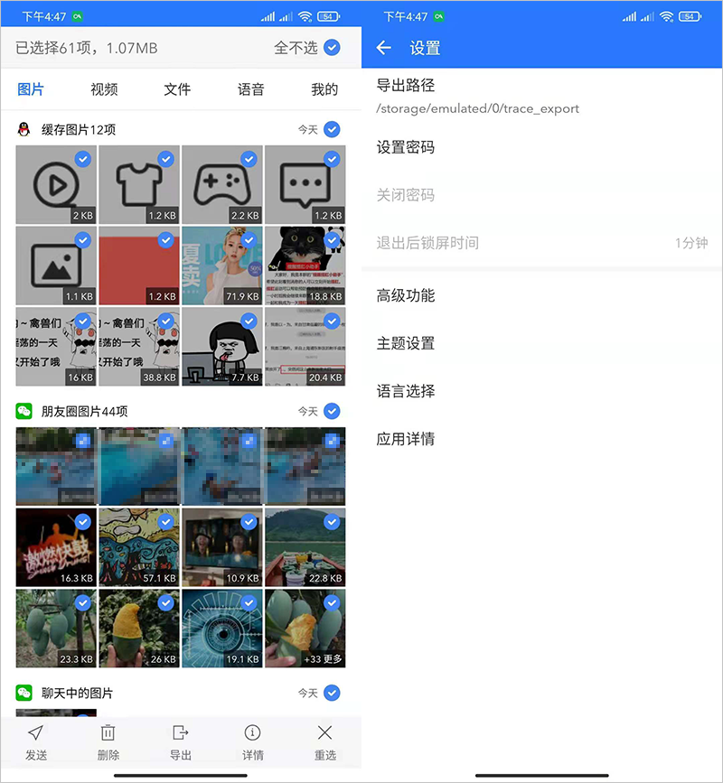 另一款导出备份的应用「微拾」支持管理微信、QQ 和 TIM 中的各类文件,支持批量导出文件,但也不支持文字内容。你可以搭配网盘云备份功能,来实现自动云备份文件。