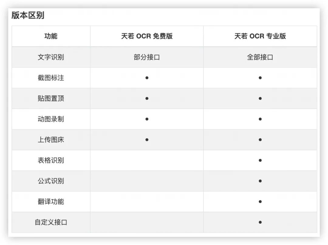天若 OCR 提供免费版和付费版两种选择,免费版提供基础识别功能,一些高级功能,比如翻译、表格识别、自定义接口等,需要购买付费版才能解锁。