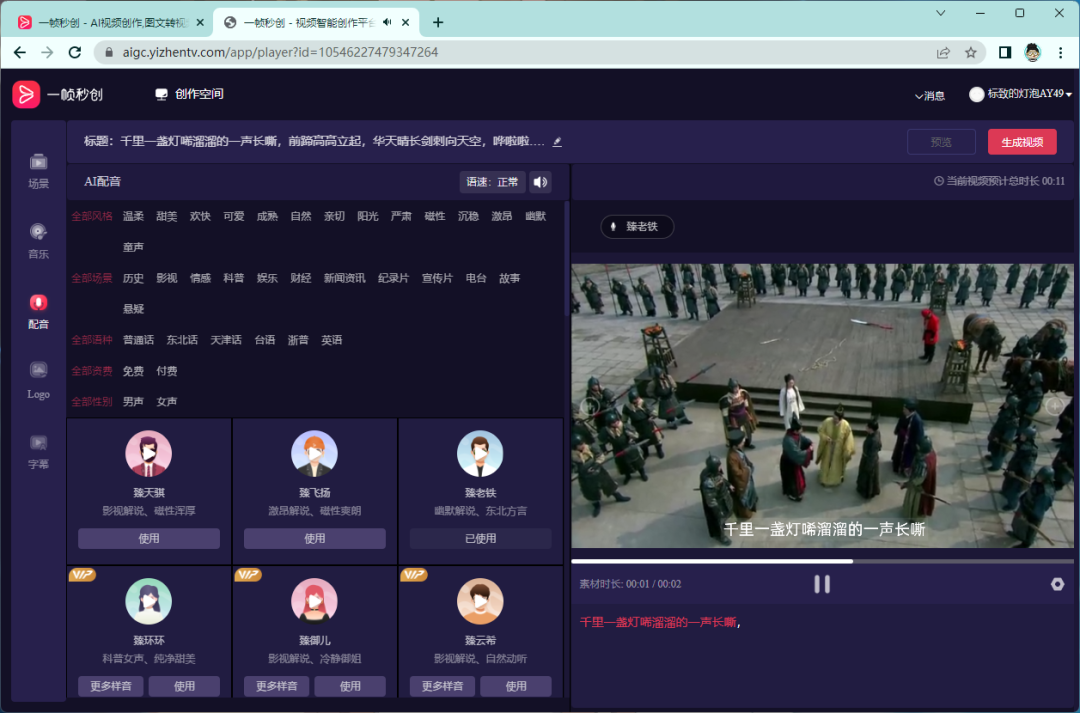 智能配音:视频除了内容要有趣,配音也很重要,在「一帧秒创」里面提供了非常丰富的配音类型可选,多种风格、多种场景可选、甚至还有语种,目前提供了普通话、东北话、天津话、台语、浙普、英语。