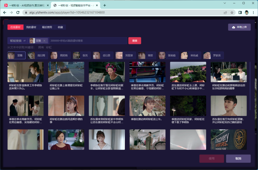 在「一帧秒创」的素材库里显示,提供了 2000000+ 秒拍AI素材搜索,所以你基本上不用担心找不到合适的视频素材使用,另外也你也可以自己上传素材插入。