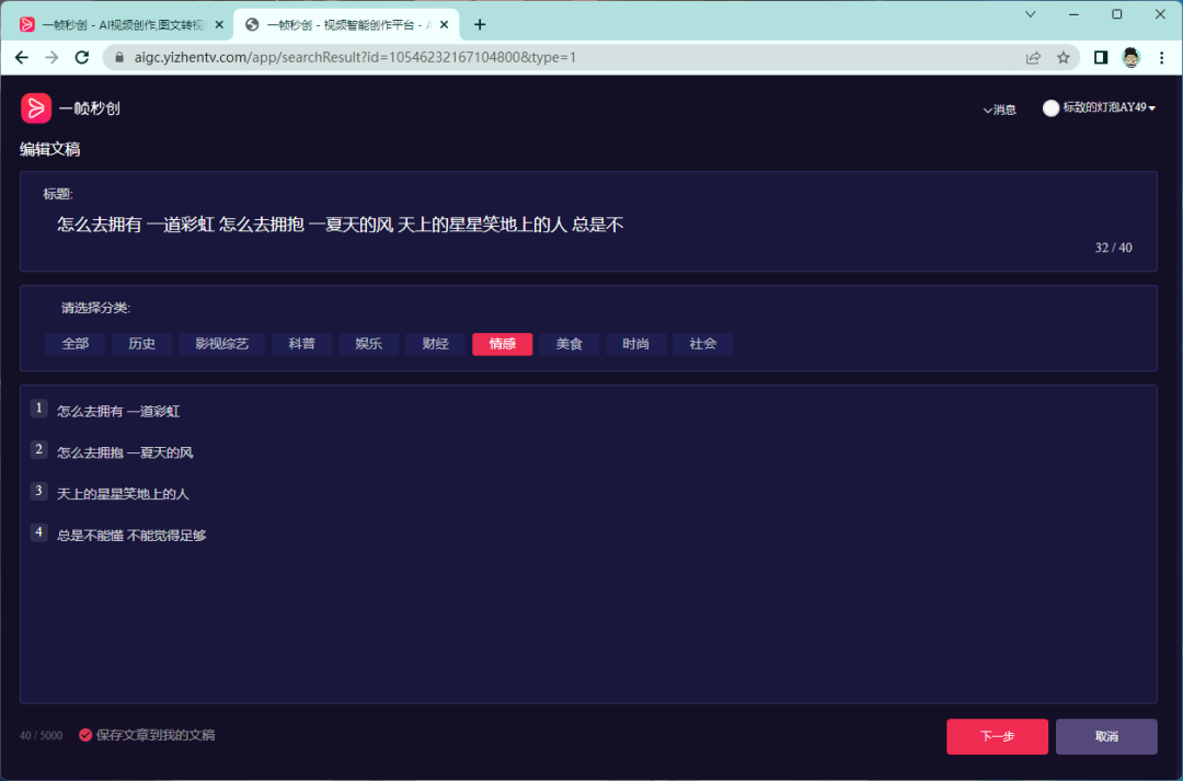 输入你的文案识别后,点击下一步可以选择视频分类,包括有:历史、影视综、科普、娱乐、财经、情感、美食、时尚、社会。当然如果你希望匹配更多的范围,可以选择全部。
