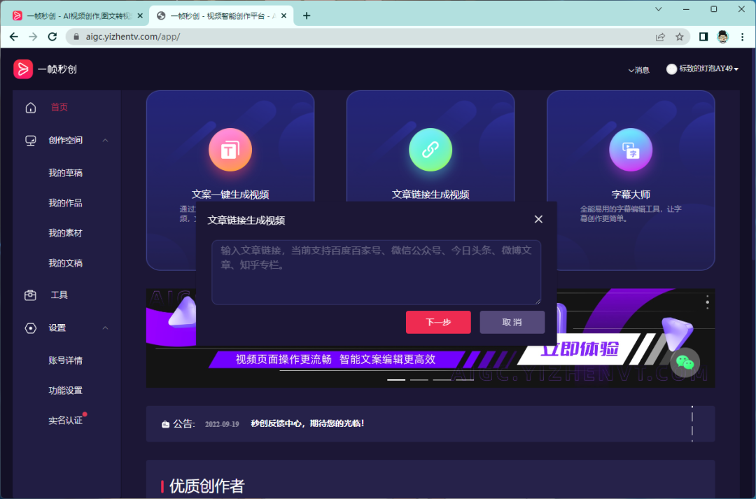 文章链接生成视频:如果你是自媒体想把之前写过的文章生成视频,通过文章链接生成视频功能,可以快速把内容生成视频。当前支持百度百家号、微信公众号、今日头条、微博文章、知乎专栏。
