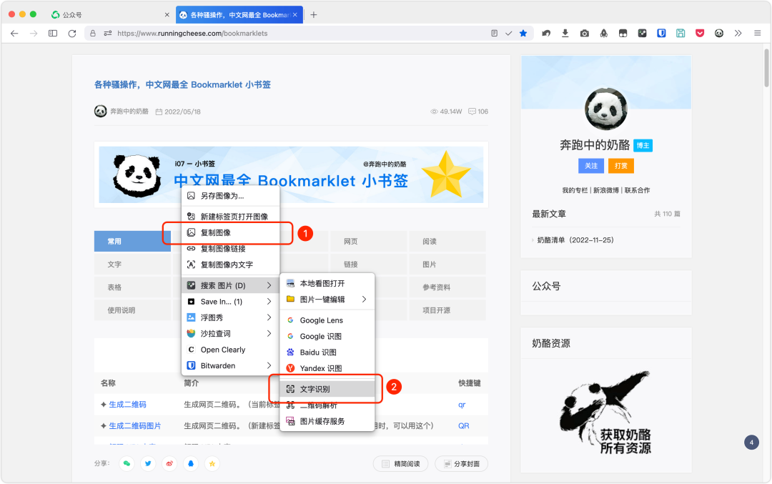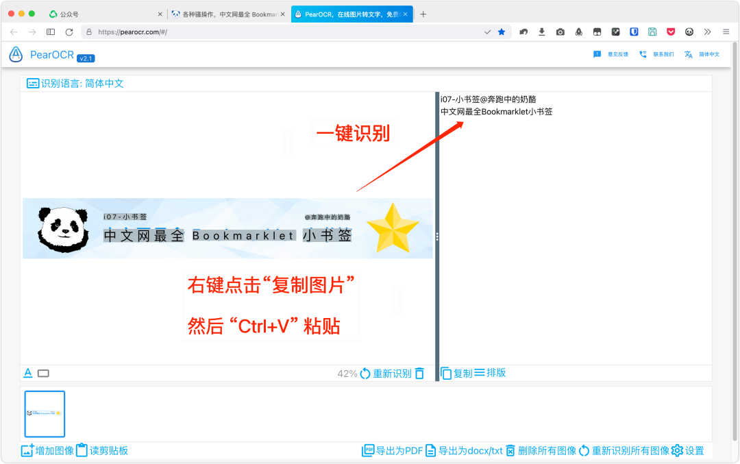 只需要先点击“复制图像”,然后点击“文字识别”,图片就会在 PearOCR 网站里一键识别,而且准确率非常的高。