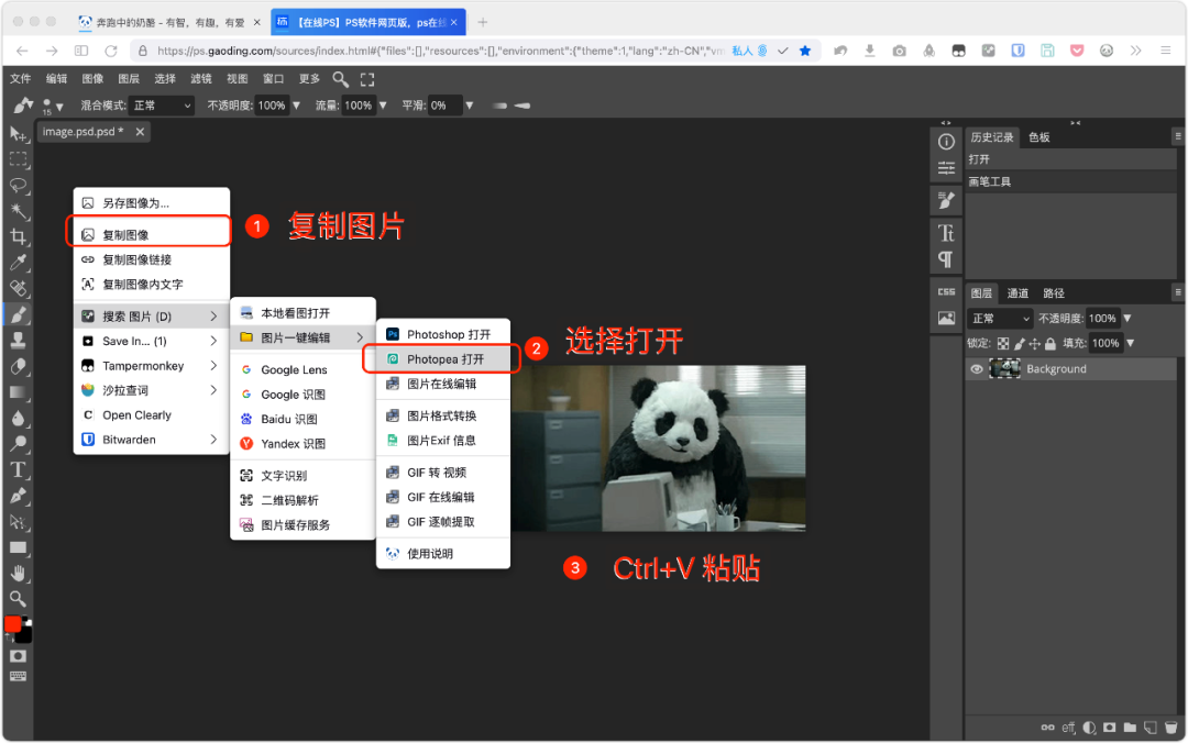 同样需要注意的是,由于限制,Photopea 无法办直接导入图片,你需要先“复制图像”,然后再 Ctrl+V 粘贴导入。