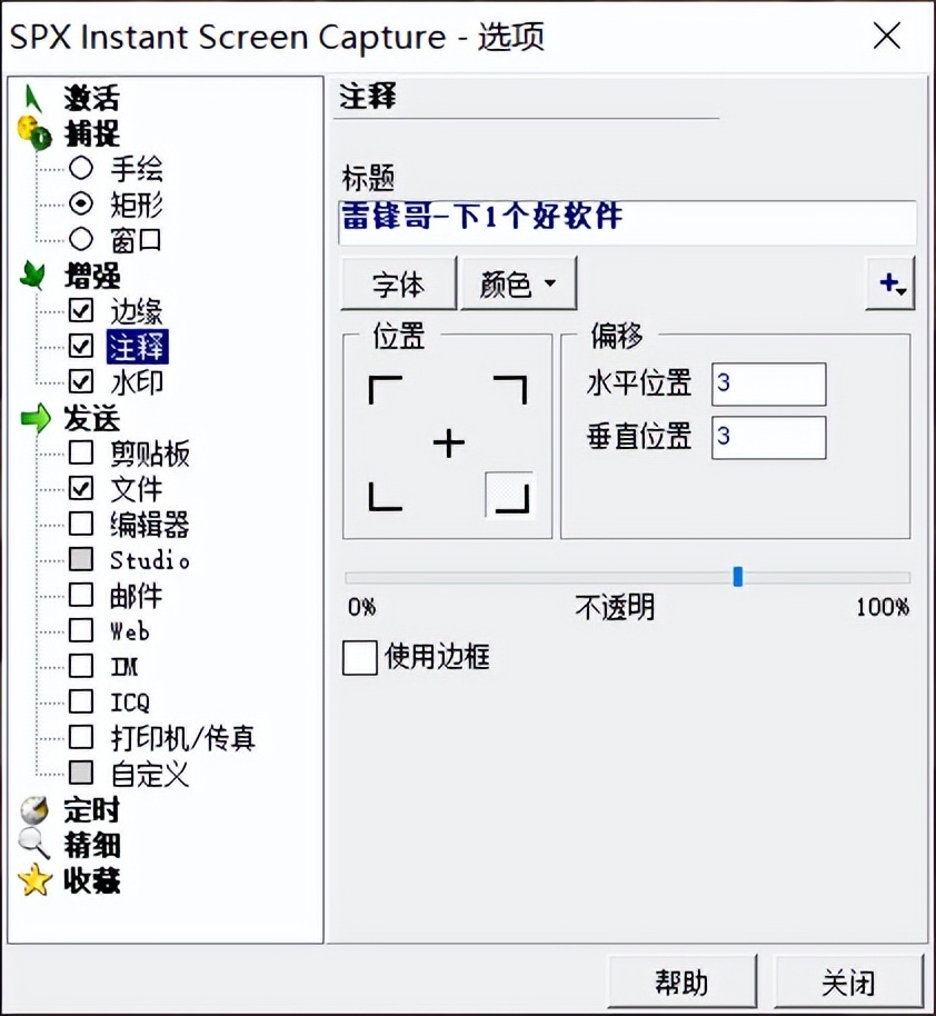 注释效果也就是截图后自动添加文字水印,支持设定图片四个角位置、可以修改字体、颜色、透明度。