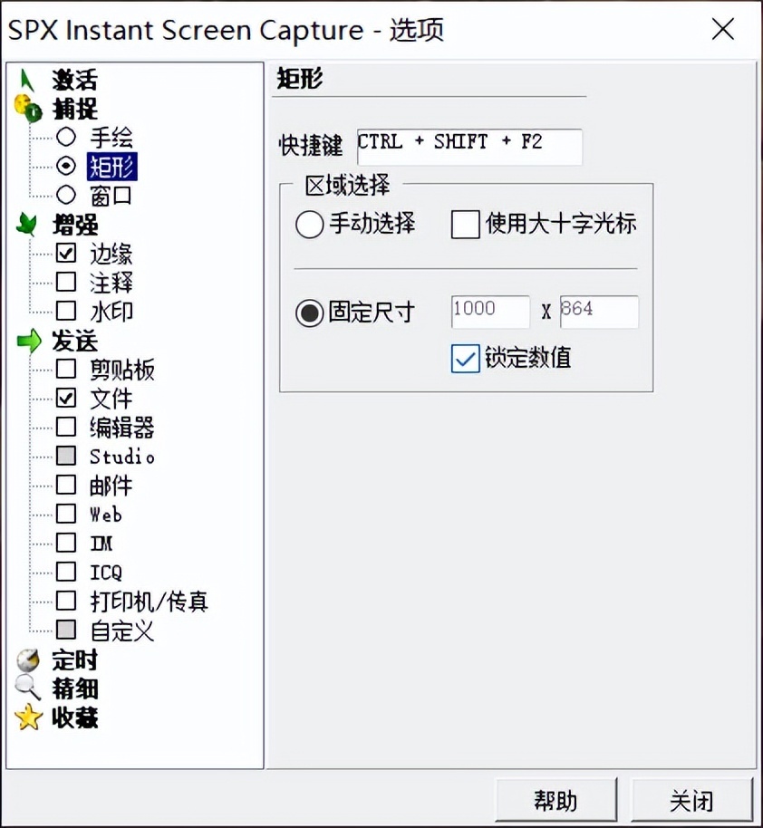 截图方面支持三种截图方式,分别是手绘、矩形、窗口,每一种模式都可以单独设置快捷键。特别说下矩形固定尺寸,特别好用,对于自媒体来说,为了文章里的图片尺寸统一大小,可以固定尺寸截图,不用二次编辑修改。