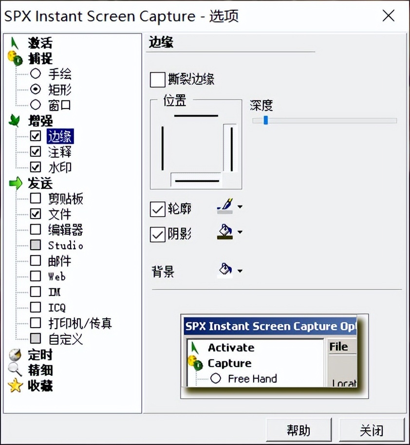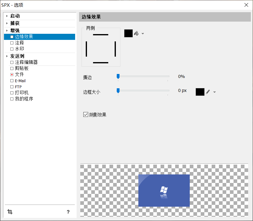 截图增强支持三种功能,边缘效果、注释、水印。截图后自动添加阴影、撕裂,这种效果在当年是非常流行,不过现在看来有点过时了。